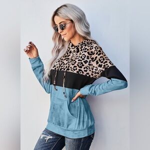 The Leopard Color Block Hoodie is a casual, long-sleeved hoodie with a drawstring. This pullover design features an animal print pattern with a Color block style that allows you to show off your wild side. It has a comfortable relaxed fit and perfect for when you want a casual style. This leopard hoodie has decorative and functional kangaroo pockets. Its the perfect hoodie for when you want to add a little dash of wild to your wardrobe.