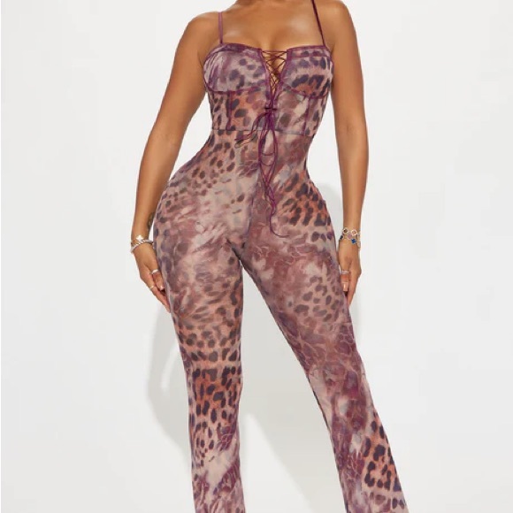 Stylish leopard print jumpsuit with lace-up front. Features a mix of brown and purple tones. Jumpsuit is mesh material.