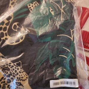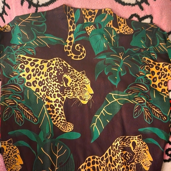 Vibrant shirt featuring a bold leopard and jungle leaf print. Perfect for making a statement. Light weight sweater.