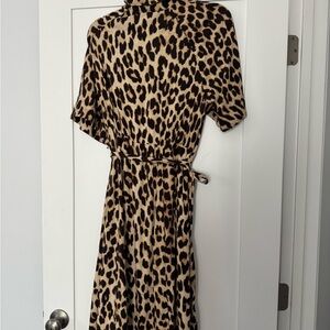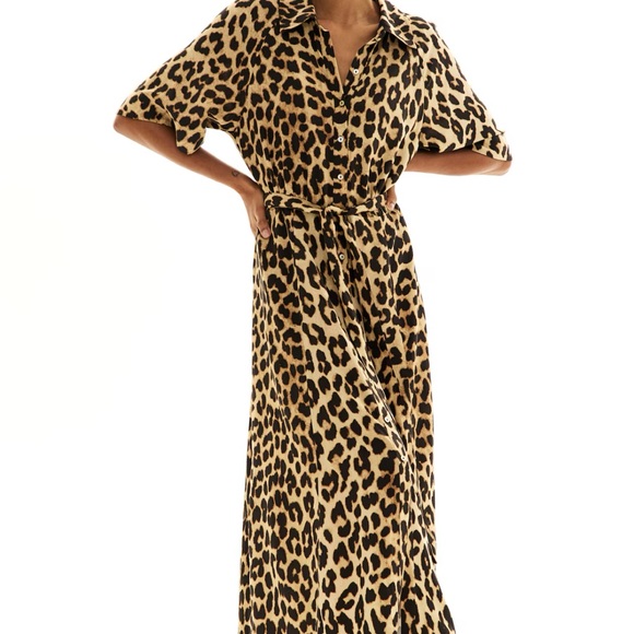 Stylish leopard print maxi dress with a tie waist. Features short sleeves and a button-up front.