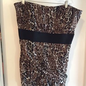 Leopard print mini-dress, size 24. Only worn twice. This dress hits mid-high in the thigh. It's stretchable, but does have a zipper on the back. It has extra space in the stomach area of the dress.