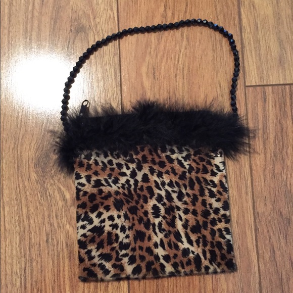 Leopard print purse with feathered top and beaded handle. Purse closes with zipper
