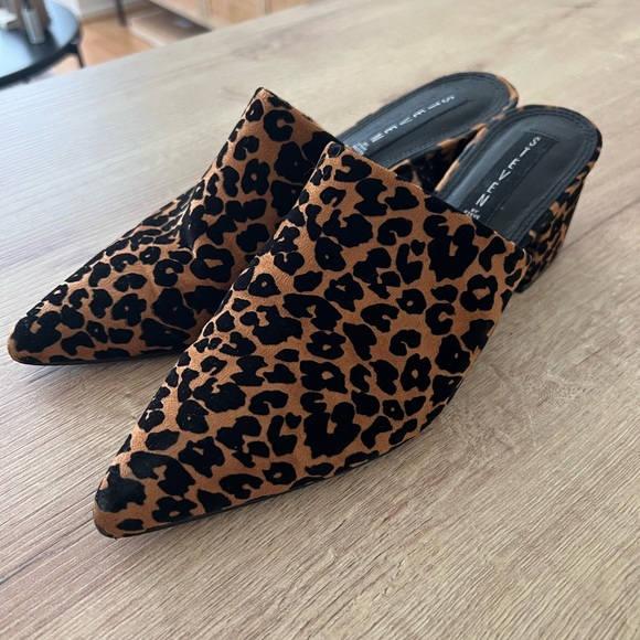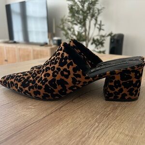 Leopard print mules with a pointed toe. Stylish and comfortable for any occasion.
