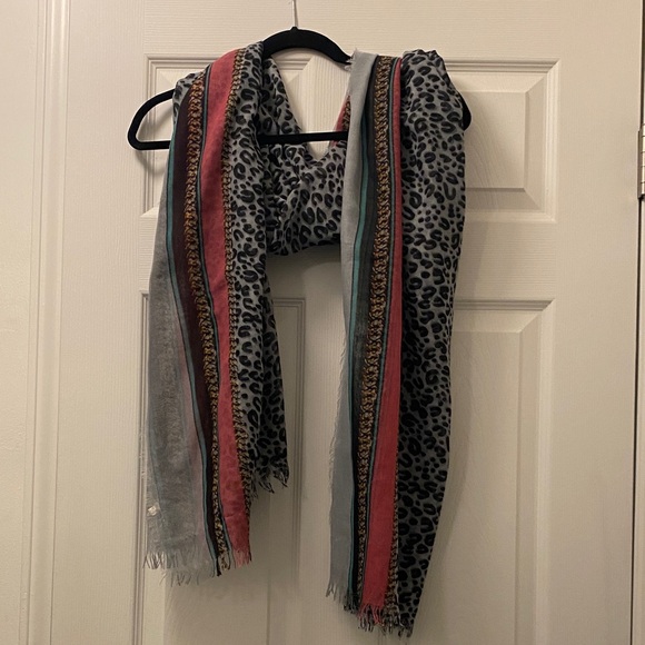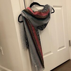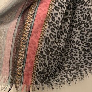 Elevate your style with this chic leopard print scarf. Featuring a blend of black, gray, pink, and gold, this accessory adds a pop of color to any outfit. Perfect for any season.