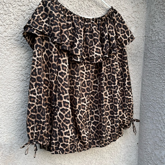 Embrace your wild side with this stylish leopard print off-shoulder top. Perfect for a night out or casual day wear. The brown and black pattern adds a bold touch to any outfit.
