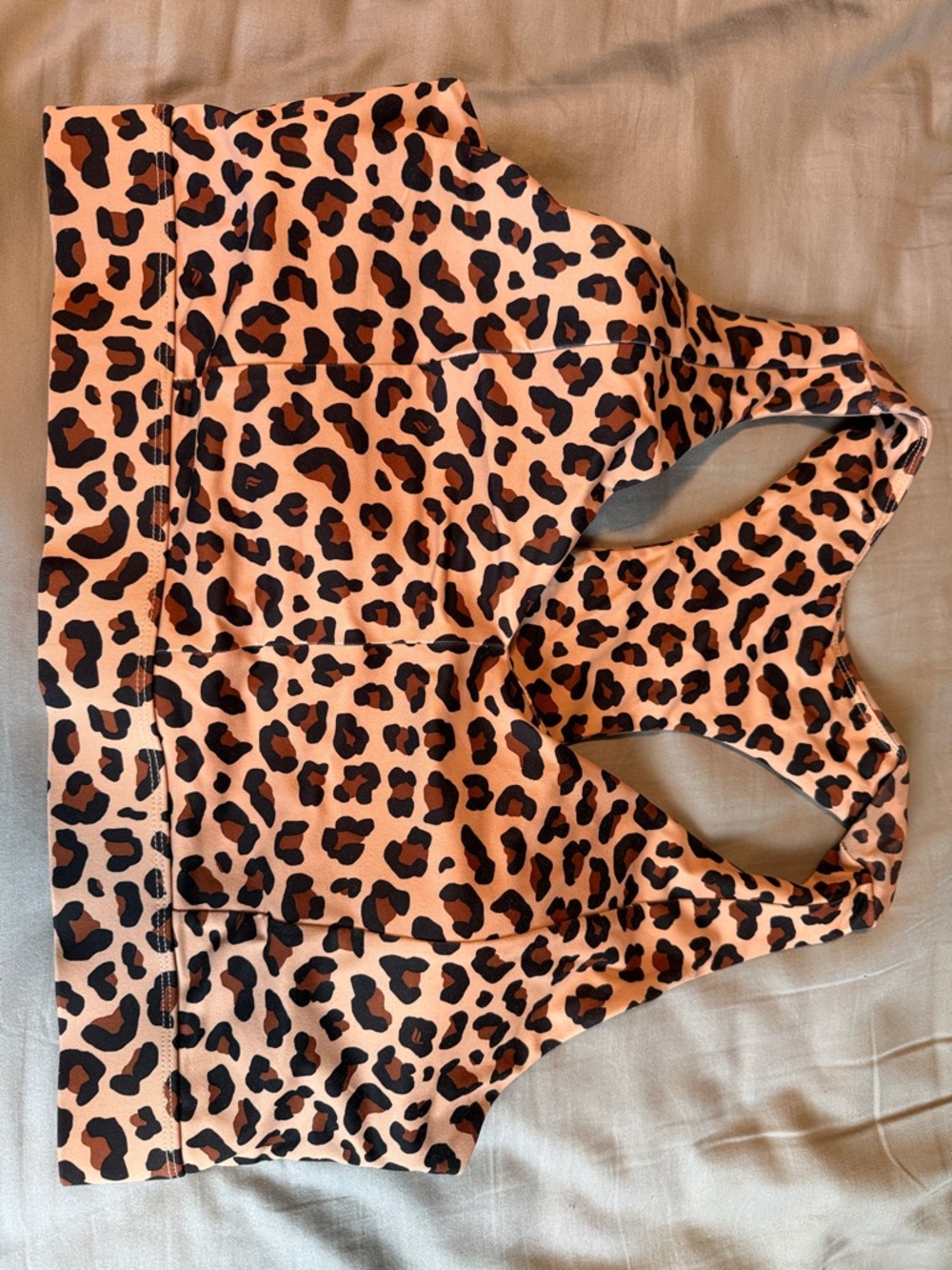 Bold leopard print sports bra with racerback. Tan background with black and dark brown spots. Stretchy, supportive fabric. Stylish everyday activewear piece. Fabletics brand. Like new. Smoke free, pet friendly home. Removable pads included.