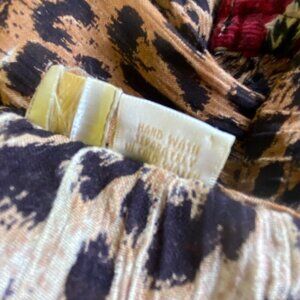 This vintage midi skirt features a striking combination of leopard print and bold red roses on a lightweight fabric. The A-line silhouette offers classic styling with gathered waist detailing and flowing design. Made in India with traditional craftsmanship.