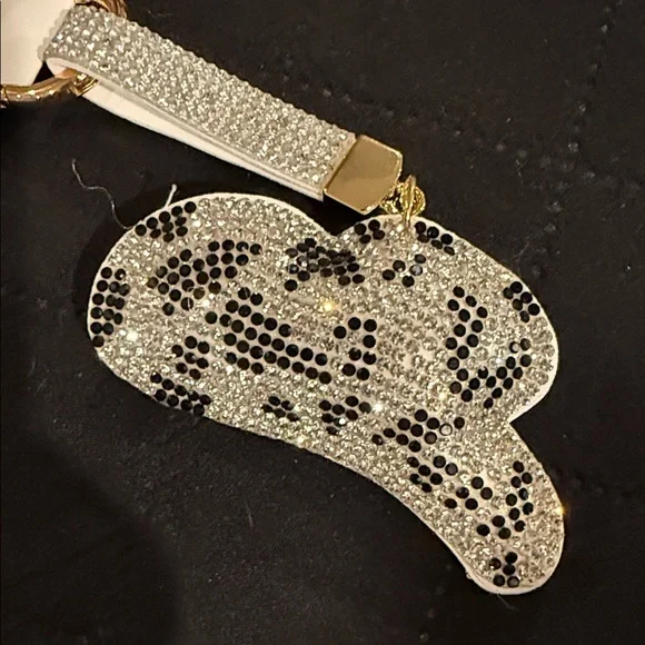 Sparkling rhinestone keychain with leopard print design. Features black and silver stones.