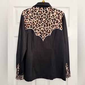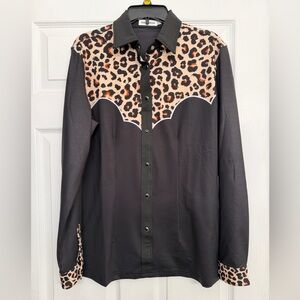 Stylish black shirt with leopard print details. Features a unique western design.