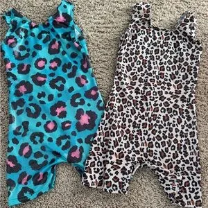 Set of two leopard print rompers. One in vibrant blue with pink accents. The other in classic brown and black. Both size 8