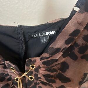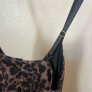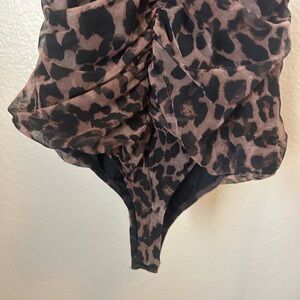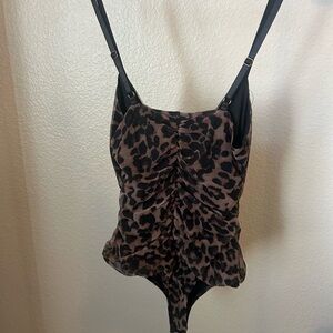 Stylish leopard print bodysuit with ruched detailing. Features adjustable straps and lace-up chain front.