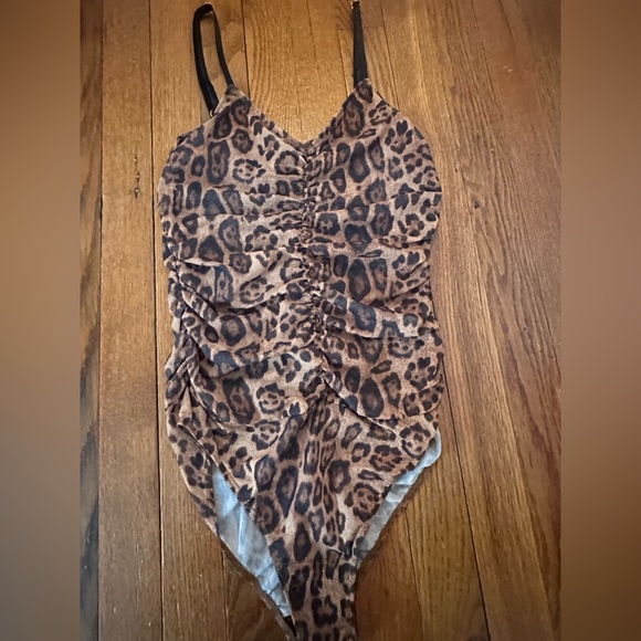 Stylish leopard print bodysuit with ruched detailing. Very flatering Brand Code x Mode