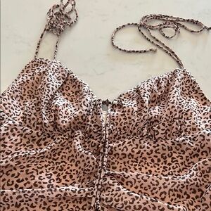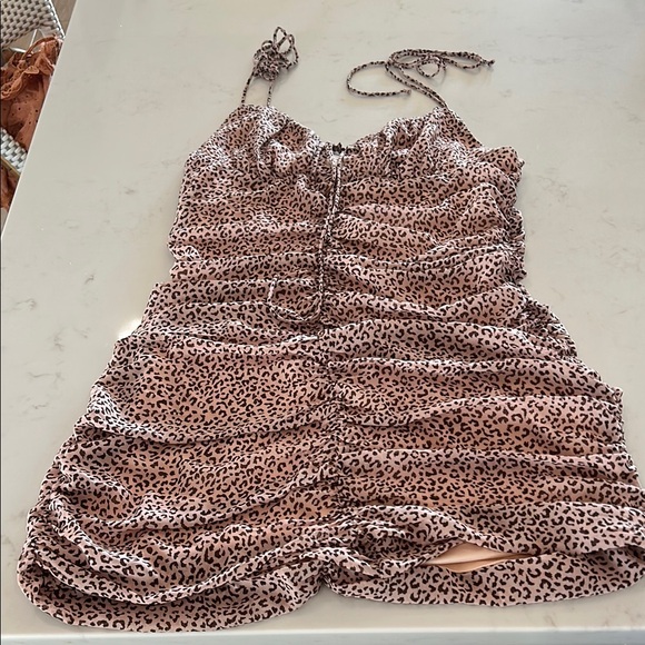 Stylish leopard print mini dress. Features ruched detailing. Perfect for a night out.