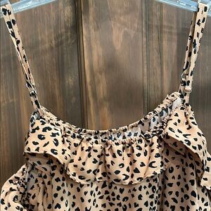 Elevate your style with this chic leopard print ruffle blouse. Perfect for any occasion, this top combines elegance with a trendy design. The tan color adds a touch of sophistication to your wardrobe. Straps are adjustable.