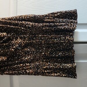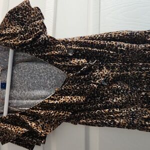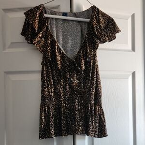 Stylish leopard print blouse with ruffle details. Features a deep V-neckline. Peplum like bottom. elastic drop waist