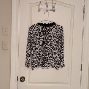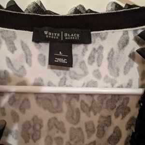 This is a leopard print cardigan with a black ruffle and buttons from White House Black Market that was only worn once or twice. Looks great with black jeans. Let me know if you have any questions!