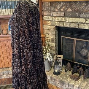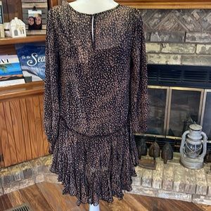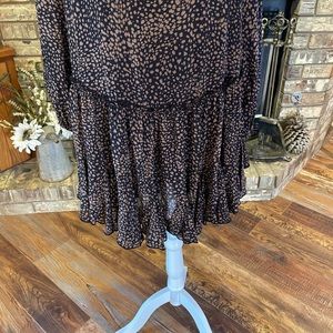 This Leopard Print Ruffle Dress boasts a relaxed fit and on-trend print in black and mocha. Featuring a crew neckline, long sleeves and elastic sleeve hems.