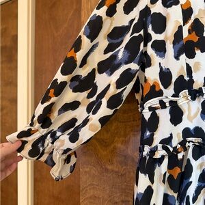 Black white multicolored leopard print mini dress. There is a small line of pulled fabric on the chest, see 6th photo. Not noticeable unless you look for it.