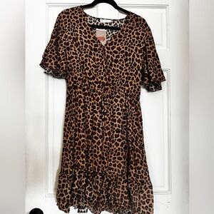Stylish faux wrap leopard print dress with ruffle sleeves and tie waist. Perfect for any occasion. NWT!
