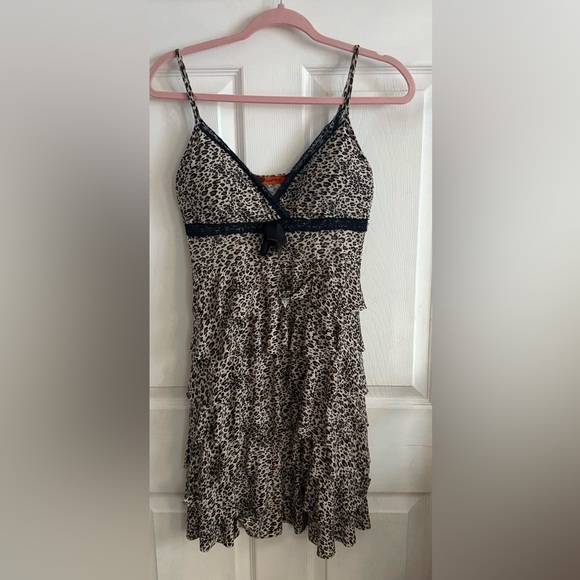 Stylish leopard print dress with ruffle details. Features black lace trim.