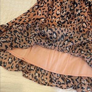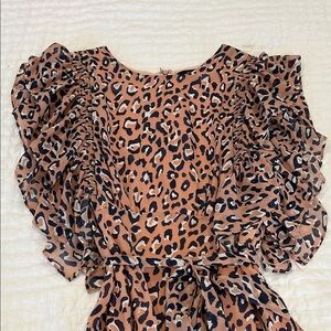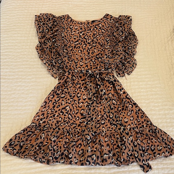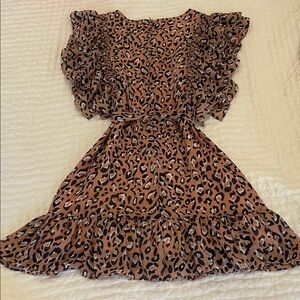 Chic tan leopard print dress with flutter ruffle sleeves. Soft, lightweight fabric for comfortable all-day wear. Includes a self-tie belt to define the waist. Versatile style for parties and everyday fun. Only worn a few times. Little loop that the belt goes through torn on one side.