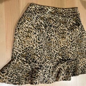 Chic mini skirt with bold animal print. Features a stylish ruffle hem. Perfect for a trendy look.