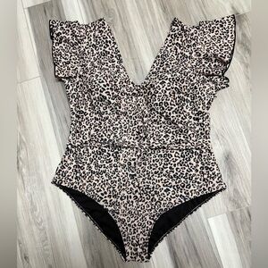 New leopard print swimsuit with ruffle sleeves. Toes around waist. Perfect for a chic beach look.