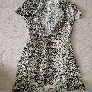 Has ties at waist that can adjust to how you want to fit. Fits more on the longer side but not like a tunic. Open front so it is worn best with tank underneath!