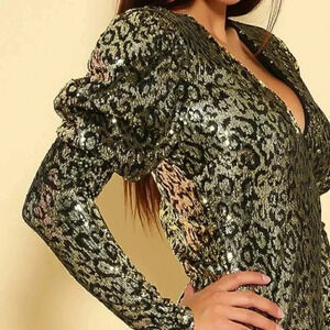 This dress is an eye catching piece perfect for a night out this summer! Featuring; sequins, animal print, padded shoulders, plunging v-cut, ruched sleeves, back zip closure, attached underlining. Followed by a fitted wear. 100% Polyester