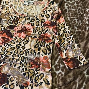 Vibrant leopard print fabric with sequins. Features shades of brown, tan, and black. Perfect condition no callouts really cute shorter sleeve ๐๐๐