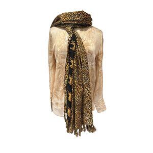 This versatile shawl wrap features a bold leopard print accented with cheetah motifs along the border, offering a striking and stylish statement.
