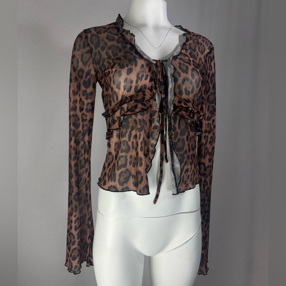 Embrace your wild side with this chic leopard print sheer top. Featuring elegant ruffles and a stylish tie-front design, it's perfect for a night out or a casual day look.