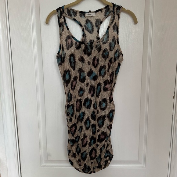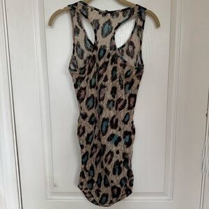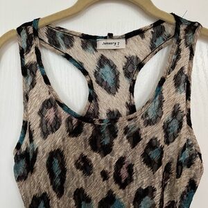 Stylish sleeveless long tank top with a leopard print design. Features a mix of black, brown, and blue colors.