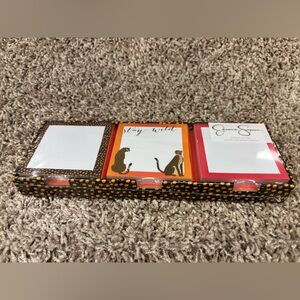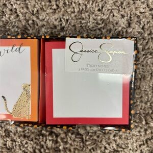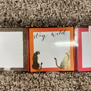 3-pack sticky note set with vibrant orange and red accents. Includes leopard motif and solid color pads for stylish reminders. Compact and colorful for everyday use. Adds a pop of orange and red to desks and planners.