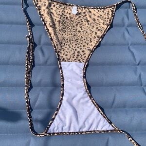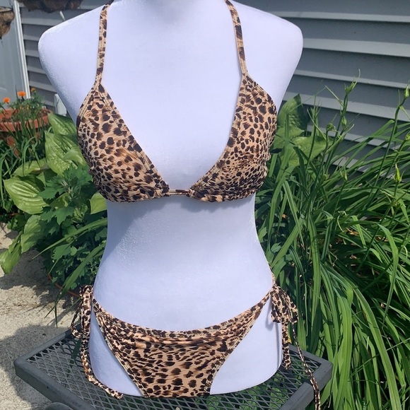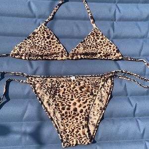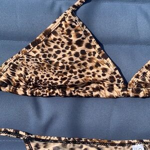 Leopard print string bikini. A nice standard bathing suit, thinner double polyester material in front, this is unpadded and has no underwire, but the top is adjustable to your liking, its moveable as the bottom string moves through the cup, rather than being connected. This is perfect to work on your tan lines! NWOT tags as it is direct from manufacturer.