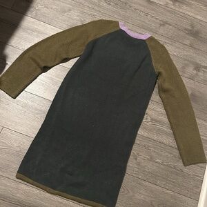 Stylish sweater dress featuring a bold leopard print. Accented with a purple collar and olive green sleeves.