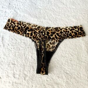 Brand new. Stylish leopard print thong with delicate black lace trim.