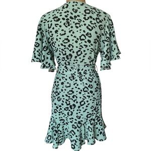 Leopard Print Turquoise Fit and Flare Flounce Wrap Dress Flutter Sleeves Medium