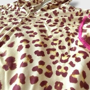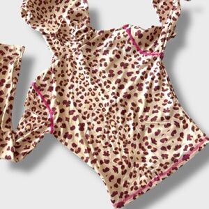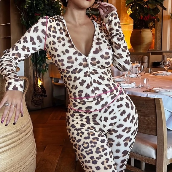 Stylish leopard print two-piece set. Features a long-sleeve top and matching pants. Perfect for a bold look.
