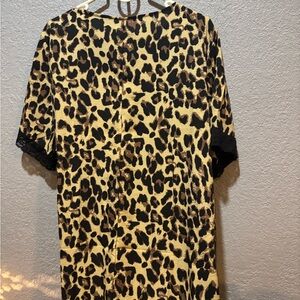 Stylish leopard print dress featuring a V-neck and lace trim. Perfect for a bold look.