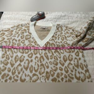 Stay cozy and stylish with this chic leopard print V-neck sweater. Featuring a soft, fuzzy cream and tan color palette, it's perfect for any casual outing. This sweater is from my personal collection It is in good condition, but I have decided to rotate some of my wardrobe. It is a fuzzy feeling sweater. No stains or tears! All of my items are well cared for and come from a smoke free home. Laundered and de-pilled!
