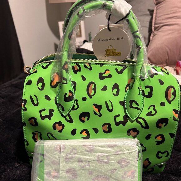NWT 2pc Vibrant Leopard Print Vegan Leather Boston Satchel Handbag & Wallet Set, đź’š Top Handle, Crossbody Strap Large Capacity, 3 inside pockets with 4 feet on the bottom and dust bag. Perfect and Stylish for adding a pop of color to any outfit.