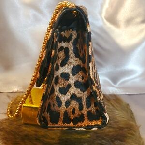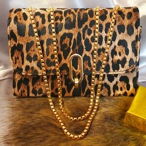 Vegan leather Leopard Print small clutch purse with goldtone adjustable crossbody chain. New in packaging.