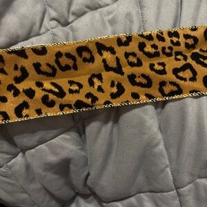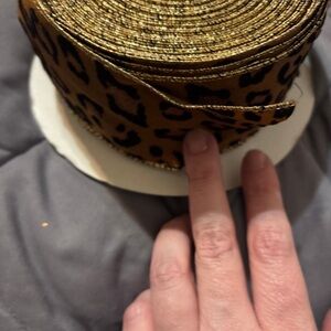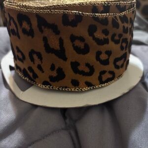 Add a touch of wild elegance to your projects with this leopard print ribbon featuring gold accents. Perfect for crafting and decorating.
