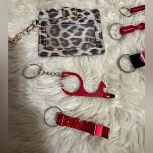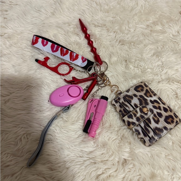 Stylish leopard print cardholder keychain set featuring pink accessories. Includes a pink safety alarm and a red self-defense tools.