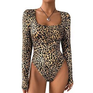 Leopard Print Long Sleeve Bodysuit Beige Brown | Sexy Animal Print Top Size Small: