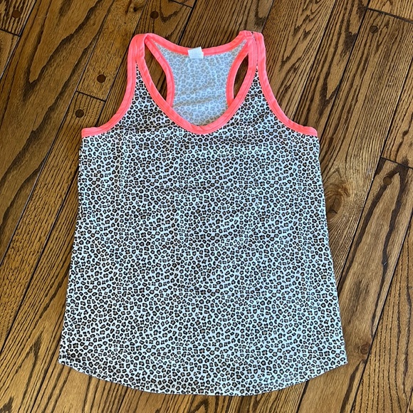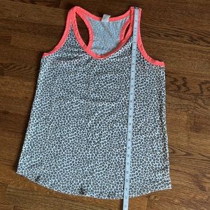 Leopard racerback tank with neon coral accents. 62% polyester, 33% rayon, 5% spandex.