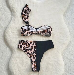 Leopard Ruffle Strap Bandeau High Waist Bikini Set