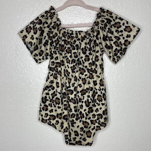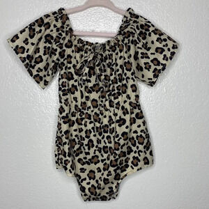 Adorable Jinxing Leopard short sleeve onesie with matching headband. Elastic neckline and waistband. Snap closure for easy changing. Comes with matching leopard headband with boho ball trim. In excellent condition. Approximately 2T