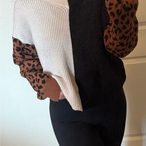 Embrace a bold look with this stylish colorblock sweater featuring striking leopard print sleeves. Perfect for adding a touch of wild elegance to your wardrobe. Size reference 5’ 4”, 130 lbs.